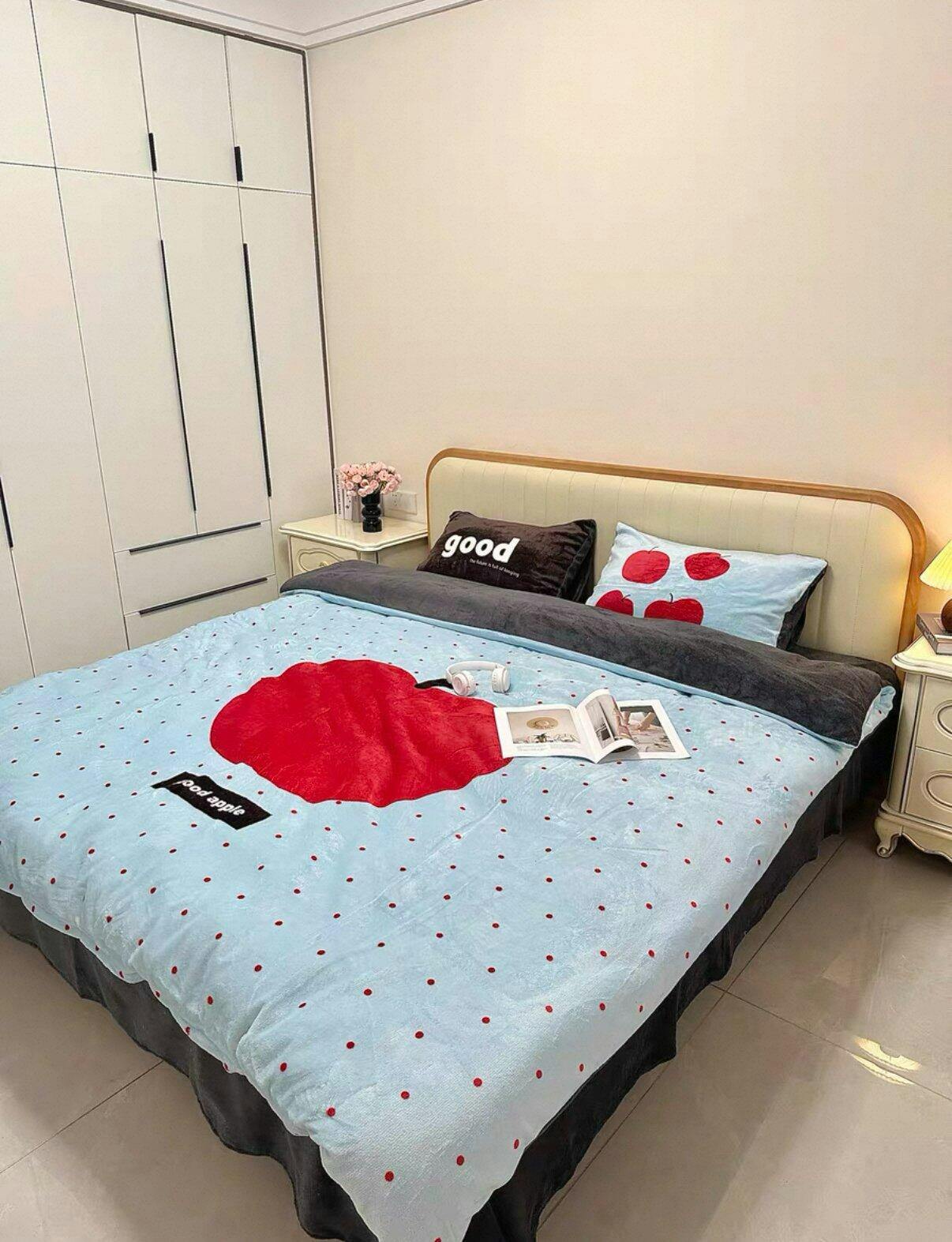 🍎 The Good Apple print = cute without trying: The big apple graphic + tiny dot details make your bed look styled even when you just tossed everything on it. It’s playful, clean, and gives that cozy Korean/INS vibe that looks expensive in photos.
