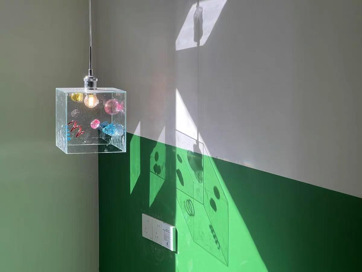 Meet your new favorite statement light: a square glass pendant light with colorful, sculptural details that look like tiny candy-glass accents floating inside a crystal-clear cube. This glass cube pendant light is the easiest way to upgrade your bedroom, kitchen island, entryway, hallway, or dining nook with a clean, modern vibe and a soft ambient glow. It’s minimal from far away, but up close it’s full of personality, making it perfect for modern apartments, playful interiors, and anyone obsessed with unique lighting that still feels high-end.