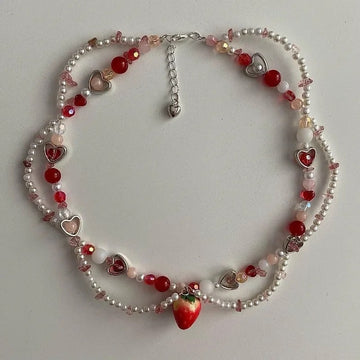 Elevate your style with this Strawberry Necklace Choker, a stunning piece of handmade jewelry perfect for lovers of cottagecore and fairycore aesthetics. Featuring delicate imitation pearls, glass beads, and a charming strawberry pendant, this adjustable Y2K necklace is ideal for creating a whimsical and romantic look. Perfect as a bridal accessory, love heart choker, or a thoughtful gift, this necklace is crafted with care to suit a variety of styles.
